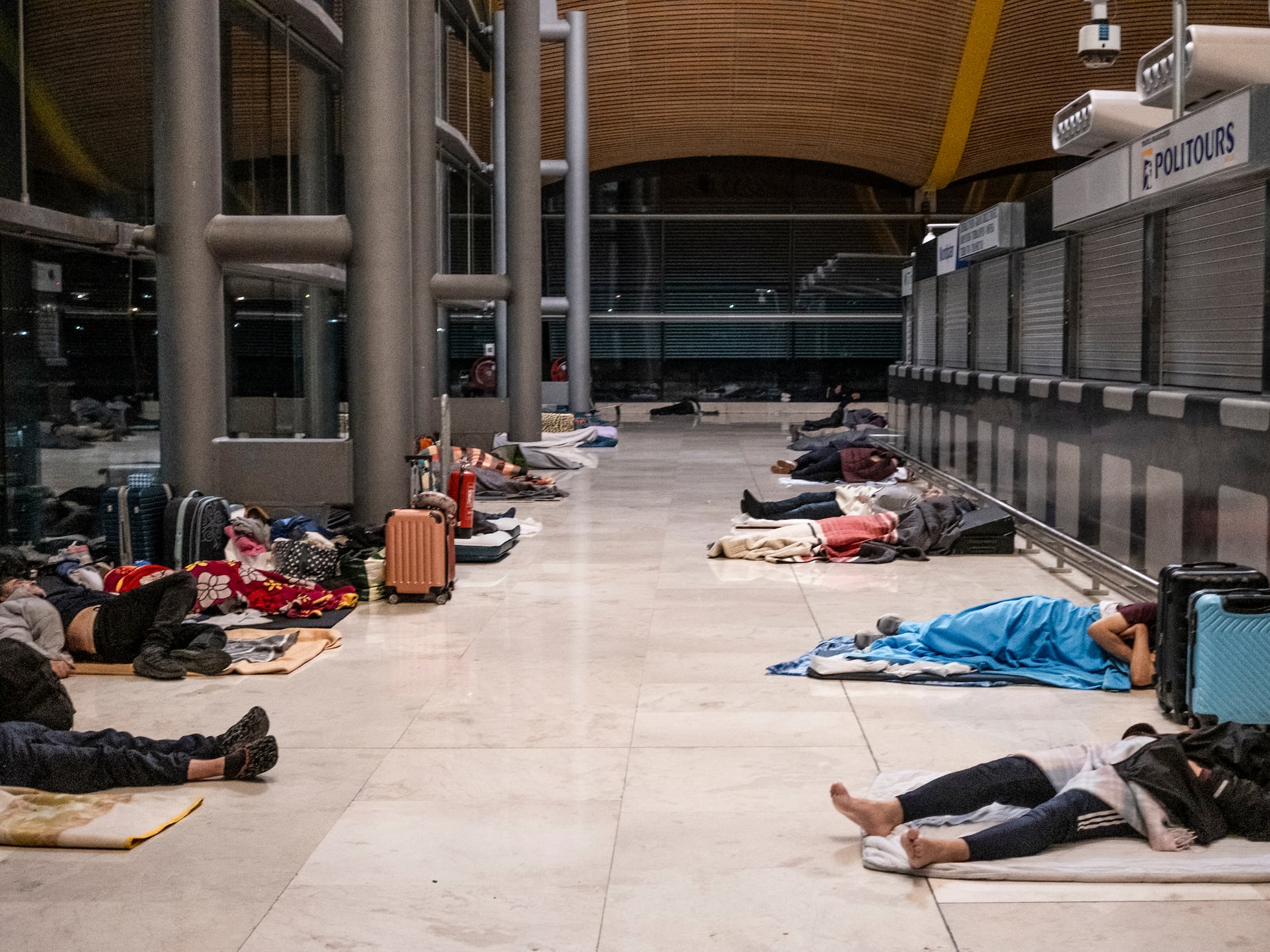 Personas durmiendo en los laterales de la Terminal 4 del aeropuerto Adolfo Suárez Madrid Barajas, el 2 de marzo de 2025. David Expósito